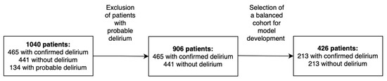Among this cohort, 465 were diagnosed with delirium, whereas 441 did not exhibit delirium, and 134 were suspected of having delirium. Probable delirium was defined as cases in which there was clinical suspicion, based on behavioral signs, medication use (e.g., neuroleptics), or medical chart notes, but where CAM-ICU assessment or formal diagnostic criteria were not consistently applied or documented. Patients classified as probable cases of delirium were excluded from the analysis to ensure that the study cohort consisted solely of cases with definitive diagnoses, minimizing potential bias and enhancing the reliability of the results. This exclusion resulted in a cohort of 906 patients. To ensure balanced group representation and minimize class imbalance bias during model development, random undersampling was applied to both groups. From the 465 patients with delirium and the 441 without, a random selection of 213 patients was generated from each class using the Balance Data widget in Orange 3 (version 3.19.0) [67], configured for undersampling without replacement. The resulting balanced dataset of 426 patients (213 with and 213 without delirium) was automatically shuffled to prevent ordering bias. This approach preserved the internal distribution of clinical features within each class while reducing bias during ML model training. Nonetheless, this strategy may introduce selection bias by excluding potentially informative data points, which could limit the generalizability of the results.