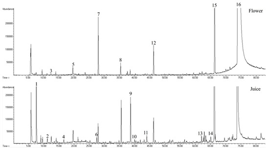Chromatograms for Nasturtium flowers and juice were obtained following the HS-SPME extraction and GC-MS analysis (Figure 2).