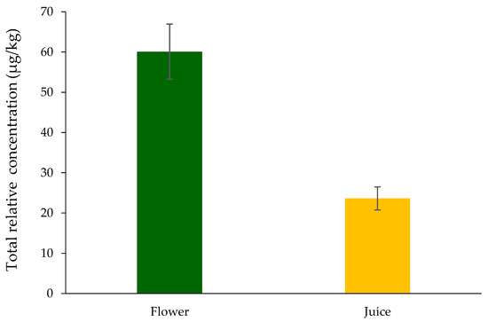 As can be observed in Table 1, the volatilomic profile of Nasturtium varied extensively between the flower and its corresponding juice. The juice possessed a much broader and intense volatilomic profile with greater numbers of compounds identified and lower total peak areas (Figure 3). Juicing damages plant tissue mechanically, which initiates enzymatic activity (lipoxygenase, myrosinase, among others) and facilitates the release or generation of VOMs through lipid peroxidation, glycoside cleavage, and other metabolic processes.
