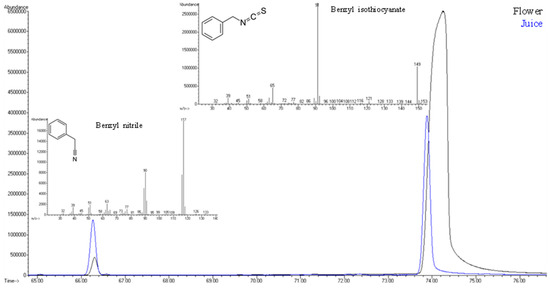 Overlap of the two main identified VOMs in Nasturtium flowers and juice—benzonitrile and benzyl isothiocyanate.