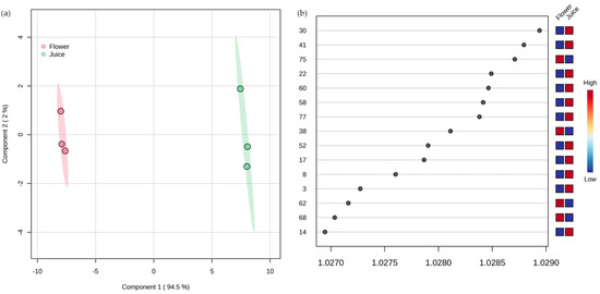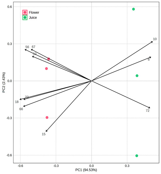 A multivariate statistical analysis was performed by the MetaboAnalyst 6.0 program to obtain the principal component analysis (PCA) and partial least squares-discriminant analysis (PLS-DA), as described in Section 2.7. According to the t-test results, the VOMs with p ≥ 0.05 indicate no statistically significant difference between the flower and juice samples, namely ethyl acetate (6), toluene (10), limonene (15), ethyl dodecanoate (50), hexanoic acid (67), and methyl tetradecanoate (72). Figure 5 shows the PCA biplot, which allows visualization of the clear differentiation between the flowers and juice. The variance of the first principal component (PC1) was 94.5%, while the second (PC2) was 2.4%, so the total of both components was 96.9% of the data variability.