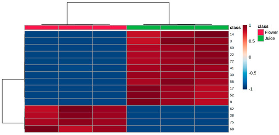 The PLS-DA of the VOMs with VIP values > 1 confirms each sample’s unique volatilomic fingerprint and demonstrates a strong distinction between the juice and flower samples. As can be observed in Figure 7, the heatmap shows two main clusters: one of compounds with consistently greater abundance in juices, namely 4-methyl-3-heptanone (14), 2-methylpropanal (3), 1,2-dimethoxy benzene (60), methyl hexadecanoate (77), 2-ethyl-1-hexanol (41), (Z)-3-hexen-1-ol (30), dodecanal (58), 2-pentyl furan (17), menthol (52) and 3-pentanone (8), and the other with VOMs having relatively greater or variable abundance in flowers, namely naphthalene (62), dimethyl styrene (38), 3-phenyl-2-propenal (75), and geranylacetone (68). This tendency for clustering also supports the discriminating ability of the selected VOMs in differentiating the two groups of samples.