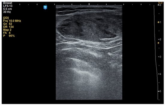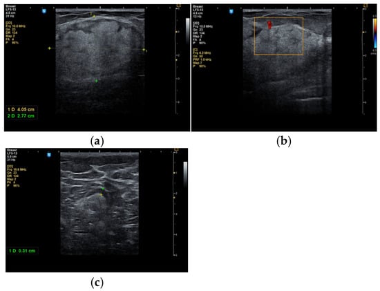 A total number of 543 patients with breast lesions were examined using ultrasonography between January 2018 and June 2023 at the “Cuza Vodă” Obstetrics and Gynecology Hospital in Iași, Romania. The number of patients with benign tumors on ultrasound was 320, representing 60% of the total patients. All cases of breast hamartoma that were surgically treated were selected from this group. Our analysis is not a comprehensive evaluation of all benign breast tumors, but rather a focused investigation on breast hamartomas. The inclusion criteria were as follows: female patients with a confirmed diagnosis of breast hamartoma through histopathological examination; cases fully documented with available clinical, imaging, and histopathological data in the medical record; post-diagnosis monitoring of at least 6 months to observe patient evolution. The exclusion criteria were as follows: patients with ambiguous diagnoses or without histopathological confirmation of hamartoma; the presence of concurrent malignant breast lesions, which may complicate the interpretation of data specific to hamartoma; incomplete data in medical records, such as missing imaging studies necessary for the initial assessment; patients who refused long-term monitoring or did not follow clinical recommendations, thus affecting the objective evaluation of lesion progression. The final count was 13 patients.