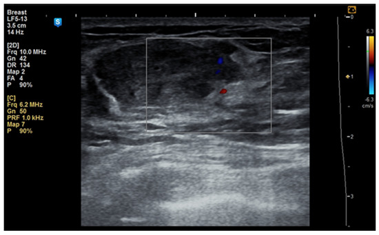 Hamartomas are predominantly composed of fibrous tissue and pose challenges in diagnosis via mammography as they often resemble fibroadenomas or carcinomas due to minimal or absent intratumoral fat. According to Masciadri et al., ultrasound examination shows a vascular score of 50% score 1, 36.66% score 0, and 13.34% score 2 [31]. Elastography reveals a color pattern with predominant dark blue and light blue areas, indicating reduced elasticity compared to surrounding tissue, likely due to higher fibrous content [16,32].
