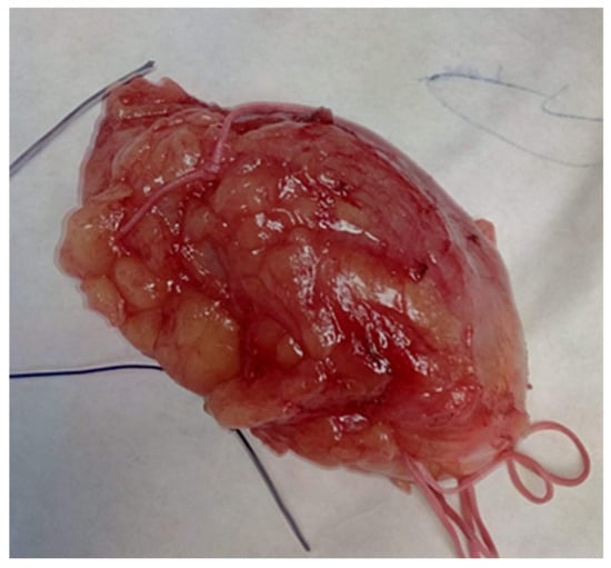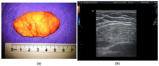 Breast lipoma in a 52-year-old woman (a) macroscopic pathological aspect; (b) ultrasound exam—hypoechoic aspect with thin striations.