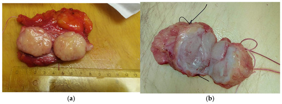 Typically, the tumor is enclosed in fibrous tissue that delineates it from the surrounding breast tissue. Upon sectioning, the hamartoma presents as a fleshy mass with a rubber-like consistency and exhibits yellow or gray coloration (Figure 6a,b).