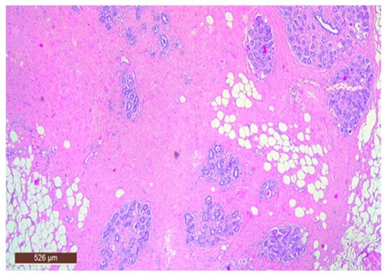 Breast hamartoma is a benign, rare tumor comprising a disorganized mixture of mature mammary tissue elements, including glandular and stromal tissues such as fatty, fibrous, adenomatous, and pseudoencapsulated lobular components, often presenting as palpable masses or incidental findings on imaging studies. These elements are unsystematic, with lobules varying in size and shape, often fusing or being disorganized. Myoid hamartomas, a subtype in which smooth muscle is prominent, can also be observed [9,10]. Smooth muscle fibers within the tumor can be highlighted through immunohistochemical examination (IHC) using desmin or actin [1]. Estrogen receptor (ER) and progesterone receptor (PR) expression in hamartomas is similar to that in normal breast tissue epithelium [11]. Additionally, IHC shows CD34 distribution in intralobular, perilobular, and interlobular regions [12], with p63, CK5/6, calponin, and myosin being positive in myoepithelial cells [13].