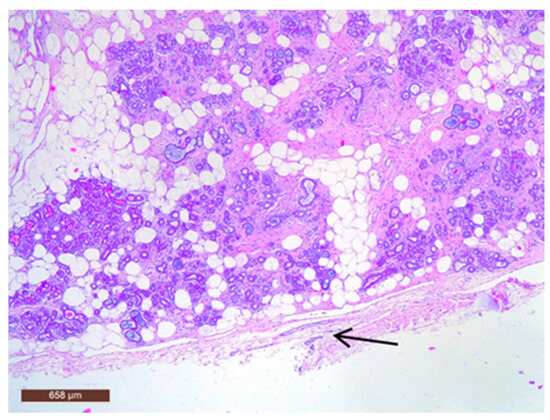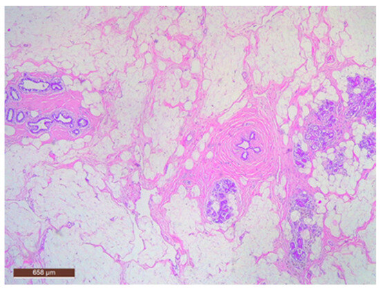 On microscopic examination, a hamartoma may exhibit three predominant components: glandular, fibrous and adipose (Figure 7). Epithelial components such as ducts and lobules are generally normal, featuring a single layer of epithelium overlying the myoepithelial cells. The fibrous component was composed of connective tissue stroma with a delicate connective tissue capsule (Figure 8). Additionally, the ducts within the hamartoma may display apocrine metaplasia (Figure 9).