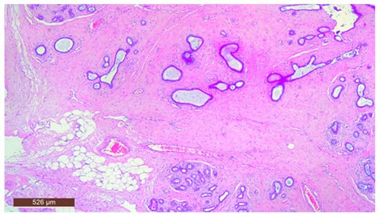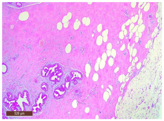 The stromal component of the lesion is frequently hyalinized and poorly defined, extending around and infiltrating lobular structures, and may exhibit characteristics of pseudoangiomatous stromal hyperplasia (PASH) (Figure 10). Epithelial hyperplasia is uncommon, with only one case of atypical hyperplasia observed in our study.