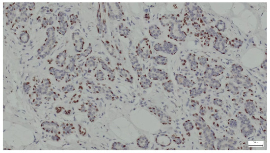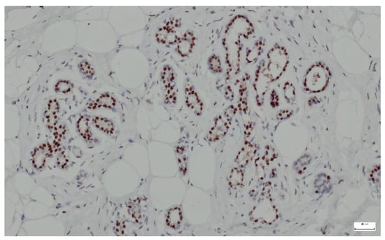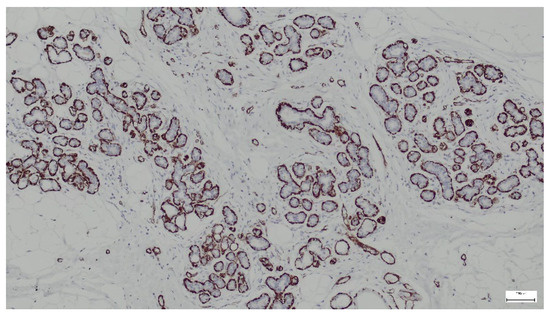 p63 is a protein that serves as a marker for basal cells in various tissues, including the breast. In the context of breast hamartoma, p63 expression can help differentiate between benign and malignant lesions and may provide insights into the myoepithelial cell population within the tumor. In all cases, p63 was strongly expressed in the nuclei of myoepithelial cells surrounding the ducts and lobules (Figure 15).