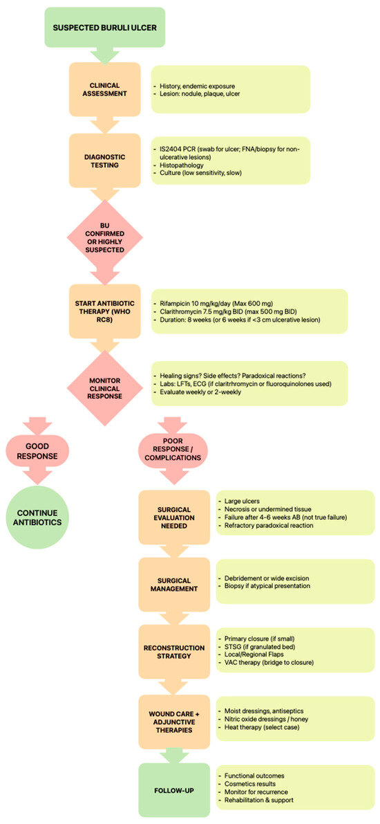 Treatment failure risks are heightened in immunocompromised patients, males, and those weighing > 90 kg, possibly due to suboptimal drug penetration, metabolic variability, or reduced clarithromycin levels caused by rifampicin-induced hepatic enzyme activity [3,55]. O’Brien et al.’s prospective study from Barwon Health identified male sex, weight > 90 kg, and immunosuppression as significant predictors of antibiotic treatment failure for Mycobacterium ulcerans (p < 0.001, 0.02, and 0.04, respectively), potentially due to lower per-kilogram dosing and highlighting the need for further pharmacokinetic research [55]. Despite these limitations, clarithromycin remains the preferred option over azithromycin due to more substantial evidence, although emerging drugs such as telacebec may eventually supplant macrolides in next-generation regimens [39]. A proposed algorithm outlining the management approach for Mycobacterium ulcerans infection is presented in Figure 1.