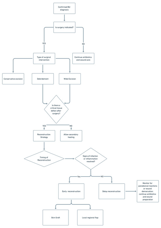 Furthermore, surgery may clarify the diagnosis in atypical or non-resolving cases, particularly where co-infection or malignancy is suspected. In paradoxical reactions (worsening of lesions despite appropriate antibiotics), excision can alleviate symptoms, improve wound healing rates, and prevent complications [91]. However, the timing of surgery relative to antibiotic initiation is still debated, and overt reliance on surgery can lead to unnecessary morbidity, highlighting the need for tailored, multidisciplinary decision-making [92,93].