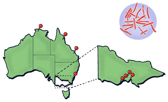Sites of reported cases of Mycobacterium ulcerans in Australia.