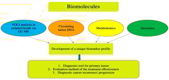 Thus, biological materials, such as blood, exhaled air, saliva, and so on, nowadays are considered promising diagnostic targets for CRC detection. Biomarkers can include various types of circulating biomolecules, such as proteins, circulating tumor DNA (ctDNA), and tumor-derived cells []. The general strategy for identifying potential biomarkers is to create a unique, broad molecular profile/panel by analyzing specific biological molecules, including ctDNA and volatile organic compounds (VOCs), and to determine the metabolic profiles of cancer cells, as well as studying genetic alterations within tumor tissues (Figure 1). Achieving this goal may involve comparing molecular profiles in cancer patients and healthy controls, and assessing changes during treatment. In clinical oncology, this data can provide information about treatment responses, risk stratification for cancer development, and treatment methods tailored to molecular subtypes.
