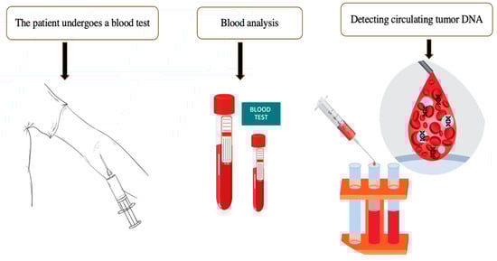 Initial observations of extracellular DNA (ecDNA) date back to the 1940s, when cell-free nucleic acids were identified in the blood of cancer patients. Nonetheless, the application of ecDNA as a diagnostic biomarker in clinical practice has only been developed and implemented in the 21st century []. Such fragments predominantly derive from apoptotic or necrotic tumor cells, although they may also originate from viable circulating cells [,]. Extracellular DNA circulating in the bloodstream of cancer patients contains tumor-specific DNA sequences detectable through liquid biopsy, a novel non-invasive diagnostic method based on blood analysis (Figure 2). This represents a promising “source” of biomarkers for minimally invasive monitoring of treatment efficacy, identifying potential targets for targeted therapy, determining drug resistance, and detecting cancer at early stages.