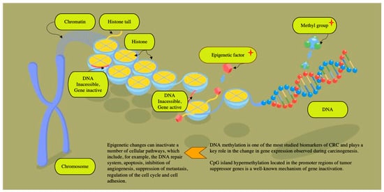 The pathogenesis of colorectal cancer involves a multitude of complex mechanisms, which include, among others, chromosomal instability (CIN), the phenotype of methylation of CpG islands (CIMP) and microsatellite instability (MSI) []. Examining DNA methylation have concluded that there are at least three subtypes of CRC, depending on the rate of DNA methylation and mutations in key genes [].