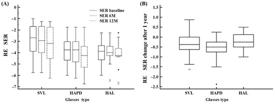 At baseline, right eye (RE) SER significantly differed among groups (Kruskal–Wallis p = 0.0138), with differences persisting at 6 months (p = 0.0273) and marginally insignificant at 12 months (p = 0.0599) (Figure 1). Similar findings were observed for the left eye (LE) (Supplementary Table S1 and Figure S1). Over time, RE SER changed significantly within all groups (Friedman test p < 0.0001 for HAPD and HAL; p = 0.0325 for SVL), except for SVL LEs (p = 0.0911). As shown in Figure 1A, the HAL group showed relatively stable RE SER values over time, compared to more variable trends in SVL and HAPD groups. Although group differences at 12 months were not statistically significant (Kruskal–Wallis p = 0.115 for right and p = 0.136 for left eyes), the HAL group displayed the narrowest IQR, indicating a more clustered distribution of RE SER values (Figure 1B; Table 2).