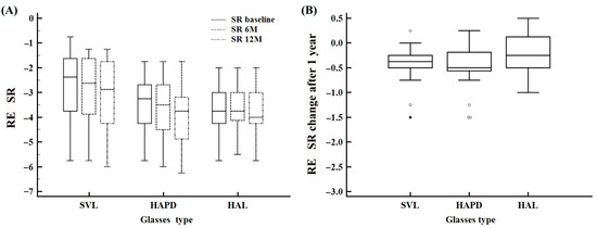 RE SR followed a similar trend to SER (Table 2). Kruskal–Wallis testing showed statistically significant differences among groups at baseline (p = 0.0174) and 6 months (p = 0.0443), but not at 12 months (p = 0.0799) (Figure 2A). Significant within-group changes over time were found in all groups (Friedman test p < 0.0001 for SVL and HAPD, p = 0.0325 for HAL). The HAL group showed the most consistent progression pattern with less variability, while HAPD demonstrated greater interindividual differences (Figure 2A). Although the 12-month median SR progression in HAL and SVL was similar, no statistically significant difference was found between them. However, the HAL group demonstrated a narrower IQR, suggesting less interindividual variability. This observation did not reach statistical significance (Kruskal–Wallis p = 0.115) and should be interpreted with caution (Figure 2B; Table 2). A similar pattern was seen in left eye measurements as well (Supplementary Table S1).