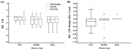 Changes in cylindrical refraction (CR) of the right eye (RE) over time and between treatment groups. (A) Distribution of CR values at baseline, 6 months, and 12 months across the SVL, HAPD, and HAL groups. (B) Total CR change after 12 months by treatment group.