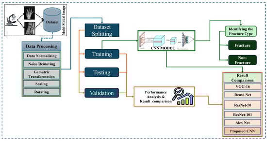 Automatic models can potentially improve diagnostic accuracy, shorten interpretation times, and relieve the workload of medical practitioners by utilizing advances in AI and machine learning [7]. These devices can quickly and reliably analyze X-ray images, identify possible fractures for radiologists to examine further, or offer prompt preliminary evaluations in urgent care settings [8]. As reported in this article, constructing a strong automatic model for bone fracture identification aims to enhance patient outcomes by optimizing the diagnostic process. This study addresses the diversity and complexity of fractures encountered in clinical practice using a dataset comprising X-ray images of fractured and non-fractured anatomical regions, including the lower and upper limbs, lumbar region, hips, and knees [9]. The training, testing, and validation sets are carefully separated, offering a strong basis for the proposed automatic fracture identification system. Applying this automated detection approach could completely transform clinical operations and patient care. Improved diagnostic efficiency allows practitioners to improve treatment outcomes and intervene more quickly [10]. Deep learning has transformed medical image analysis, especially convolutional neural networks (CNNs), which make it possible to automatically, accurately, and quickly interpret complicated visual data. CNNs are very good at identifying minor elements in medical imaging, including anomalies or disease signs, since they collect spatial hierarchies within images [11,12]. CNNs are essential in many diagnostic applications, such as organ segmentation, fracture recognition, and tumor detection, due to their capacity to learn from large datasets [13,14]. As a result, CNN-based models are helping medical practitioners identify patients more quickly and accurately [15].