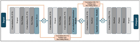 and an excitation operation through fully connected layers and nonlinearities: = σ ()), where denotes ReLU, σ denotes sigmoid activation, and is the resulting scale vector. The input is then reweighed as = . Subsequent convolutional layers use 64 filters, and their output is fed to the convolutional block attention module (CBAM), which gradually applies channel and spatial attention.
