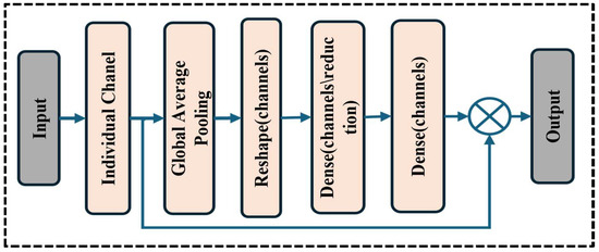 where the average- and maximum-pooled features for the channel are denoted by and . Channel attention weights are then calculated by processing these descriptors through a shared multi-layer perceptron (MLP). To restore the original channel dimensions, the MLP comprises an expansion layer after a reduction layer (with a reduction ratio of r). The result is calculated as follows: