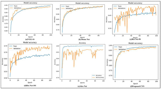 The training accuracy and validation accuracy of the six different algorithms, which are represented graphically: (a) VGG-16, (b) Dense Net, (c) Res Net-50, (d) Res Net-101, (e) Alex Net, and (f) proposed CNN.