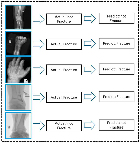 Figure 9 shows the graphical prediction results generated by the proposed CNN model on X-ray images, emphasizing its ability to accurately classify fractured and non-fractured cases. Most predictions align accurately with the labels, revealing the model’s robustness for real-world techniques. The model’s importance in supporting clinical diagnosis is demonstrated by its notable ability to detect small fractures, which are sometimes difficult to recognize. Overall, this study’s results highlight the potential of automated bone fracture detection models to enhance diagnostic efficiency and accuracy in medical imaging. Figure 9 shows representative X-ray images with the model’s predicted classification results, both clear and fine, and the successful detection of clear and less-visible fractures. These examples highlight the model’s sensitivity for subtle dissection and structural variations in the areas of bones, especially in challenging cases where fractures are visually minimal and easily missed by the human eye. By incorporating these qualitative results, the proposed attention-based CNN results confirm the clinical reliability of the model and its potential utility in real-world clinical scenarios.