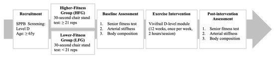 This study adopted a quasi-experimental design with two comparison groups to investigate the effects of an advanced Vivifrail D-level exercise intervention on functional fitness, arterial stiffness, and body composition in community-dwelling older adults. Participants were non-randomly assigned to either the HFG (n = 22) or the LFG (n = 19) based on their lower-limb muscle strength, stratified by the 30 s chair stand test and SPPB levels (Figure 1). This non-random allocation was based on validated age-specific thresholds from the 30 s chair stand test to stratify participants by baseline lower-limb strength. This design enabled targeted comparisons of physiological responsiveness. Potential selection bias was minimized through strict inclusion/exclusion criteria, standardized measurement conditions, and adjustment for baseline differences via repeated-measures ANOVA.