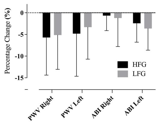 Following the 12-week Vivifrail D-level intervention, a significant within-group reduction in the left ABI was observed in the LFG (from 1.14 ± 0.05 [95% CI 1.117–1.163] to 1.10 ± 0.06 [95% CI 1.073–1.127], p = 0.0050, η2 = 0.3622), indicating a large effect size. Meanwhile, no significant changes were noted in PWV or the right ABI within either group (Table 1). When expressed as a percentage change from baseline, there were no significant between-group differences in right PWV (HFG: −5.7% ± 8.7% vs. LFG: −5.1% ± 7.9%, p = 0.416), left PWV (HFG: −4.8% ± 9.8% vs. LFG: −3.3% ± 7.4%, p = 0.296), the right ABI (HFG: −0.6% ± 3.5% vs. LFG: −1.2% ± 6.6%, p = 0.374), or the left ABI (HFG: −2.4% ± 4.4% vs. LFG: −3.6% ± 5.0%, p = 0.218) (Figure 2).