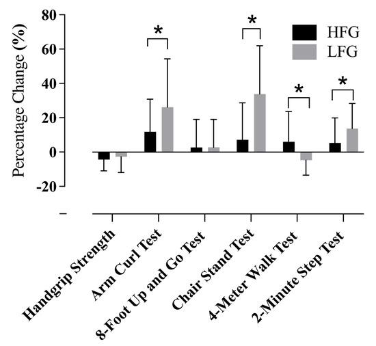 Percentage changes in functional fitness measures following the 12-week Vivifrail D-level exercise intervention. Data are presented as mean ± standard deviation. HFG = higher-fitness group; LFG = lower-fitness group. * indicates a significant difference between HFG and LFG (p < 0.05).