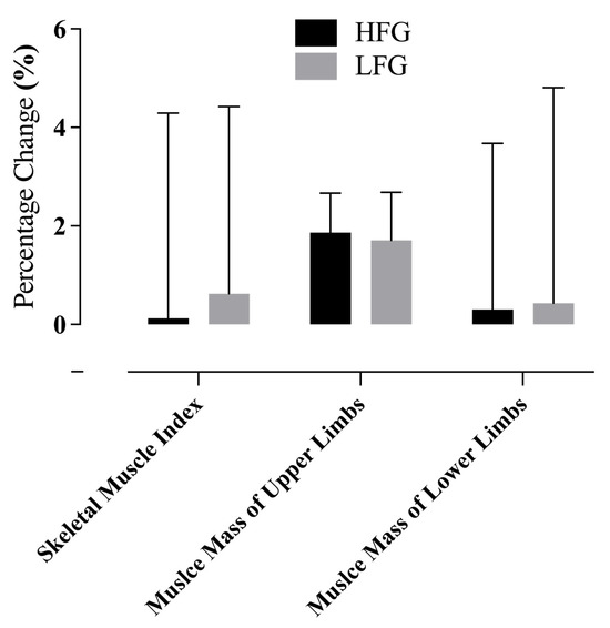 Following the 12-week Vivifrail D-level intervention, no significant within-group or between-group differences were observed in the SMI, muscle mass of upper limbs, or muscle mass of lower limbs. When expressed as a percentage change from baseline, no significant differences were found between the HFG and LFG in the SMI (HFG: 0.1% ± 4.2% [95% CI −0.89–1.16] vs. LFG: 0.6% ± 3.8% [95% CI −0.15–1.01], p = 0.360, η2 = 0.0233), muscle mass of upper limbs (HFG: −1.6% ± 5.1% [95% CI −4.25–0.65] vs. LFG: 0.3% ± 3.4% [95% CI −1.98–1.46], p = 0.183, η2 = 0.0248), or muscle mass of lower limbs (HFG: −0.3% ± 3.1% [95% CI −2.31–1.31] vs. LFG: 0.4% ± 4.4% [95% CI −2.16–2.10], p = 0.461, η2 = 0.0003) (Figure 4).