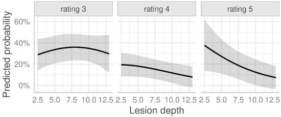 Predicted probabilities of SR CEUS ratings 3 to 5 (adequate, good and excellent, respectively) depending on the lesion depth (cm), defined as the distance from the skin to the center of the lesion, as estimated from an ordinal regression model (see Table A1 in the Appendix A). The model’s predictions are accompanied by 95% confidence bands (shaded area).