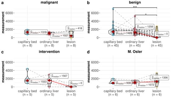Box–violin plots comparing the different liver regions for malignant (a) and benign (b) cases, the intervention group (c), and patients with Morbus Osler (d). For a complete list of p-values, see Table A2 in the Appendix A. * p < 0.05, *** p < 0.001.