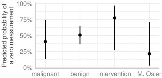 In the malignant lesions, we obtained lower measurements in the lesion itself than in normal liver tissue or the hepatic capillary region. This pattern was also repeated for benign lesions. We observed significant differences in the measurements in the benign group in the capillary region against lesion (p < 0.001) and normal liver tissue against the lesion (p = 0.002). In contrast, the Morbus Osler group showed the exact opposite picture, with the highest number of measurements in the lesions. However, these measurements were not significantly different from those in the capillary region (p = 0.219) or normal liver tissue (p = 1.000). Further differentiation based on the examined liver regions revealed that the highest values for the lesion were found in the malignant lesion group and Morbus Osler group, although no significant differences were detected (see Table A4 and Table A5 in the Appendix A). Additional analysis showed that the calculated probability of an undetectable measurement was highest in the intervention group and lowest in the Morbus Osler group (Figure 5).