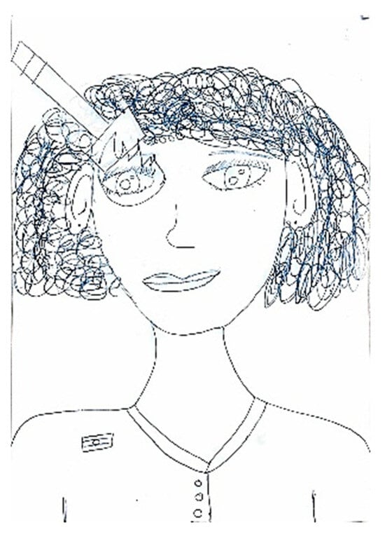 Mosquera and Martino [17] analyzed children’s and adolescents’ drawings to identify migraine in headache patients. The study involved 48 patients aged 5 to 19 years diagnosed with headache. Each child was asked to draw their perception of the pain, focusing on its location, intensity, and associated symptoms. The drawings were independently evaluated by two pediatric neurologists: one performing an artistic assessment, the other a clinical diagnosis. This protocol assessed the predictive accuracy of artistic evaluation relative to clinical findings. The study revealed that 75% of the drawings depicted pain as unilateral, primarily in the orbital or temporal regions, consistent with the typical characteristics of migraines. In 20% of cases, the drawings showed generalized or bilateral pain, often associated with less severe or atypical migraines, while 5% of the drawings lacked specific pain localization but included abstract or emotional elements to express discomfort. Symbolic elements, such as lightning bolts, dark clouds, or sharp lines, were present in 60% of the drawings, reflecting the intensity of the pain. Emotional imagery, such as tears or exaggerated expressions, appeared in 30% of the cases, whereas 10% of the drawings were minimalistic but still conveyed the perception of pain. The color choice was another significant aspect, with colors like black, gray, and dark blue dominating 80% of the drawings, correlating with severe or distressing headache experiences. Bright colors appeared in 20% of the drawings, often associated with milder or less disabling headaches. The artistic diagnosis accurately predicted the clinical diagnosis of migraine with a sensitivity of 69.6%, specificity of 88%, positive predictive value of 84.2%, and a negative predictive value of 75.9%, demonstrating a strong concordance between the visual analysis of the drawings and the clinical evaluation based on IHS criteria. However, in 15% of the cases, the artistic diagnosis either underestimated or overestimated the severity of the migraine or failed to identify atypical features [18].
