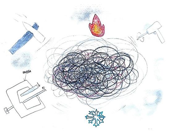 Different types of pain quality are also represented with specific symbols. Pulsating pain might be depicted using visuals like hearts, hammers, drums, pendulums, or with onomatopoeic words like “pum pum” or “bam bam.” On the other hand, pressing pain could be symbolized by images of stones or weights placed on the head, clamps, hands gripping the head, or gears. Pain that creates a sensation of tightness or constriction is often portrayed with bandages or knots squeezing the head. Stabbing pain is frequently illustrated with knives or drills, while burning pain is commonly represented with flames, candles, or fire [11,14,15].