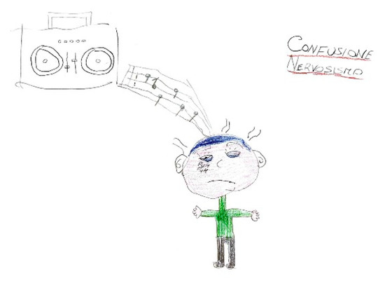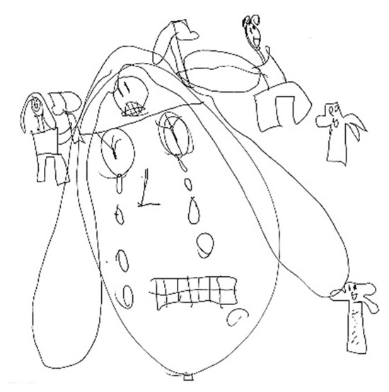 The expression of pain in children occurs in different ways, but it is possible to highlight some characteristics common to many drawings. Headaches are frequently represented as a round geometric figure, a mass, or a stone placed where the brain should be. Brain fog takes on the characteristics of a grey fog or cloud Figure 23. In children who have learned to write, spontaneous writing of captions and explanations is often associated, elaborating on how pain varies, and the emotions associated with it Figure 24. High-intensity pain is generally represented with expressions of sadness and tears Figure 25.