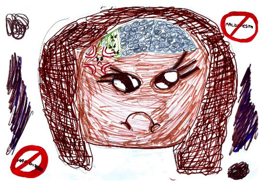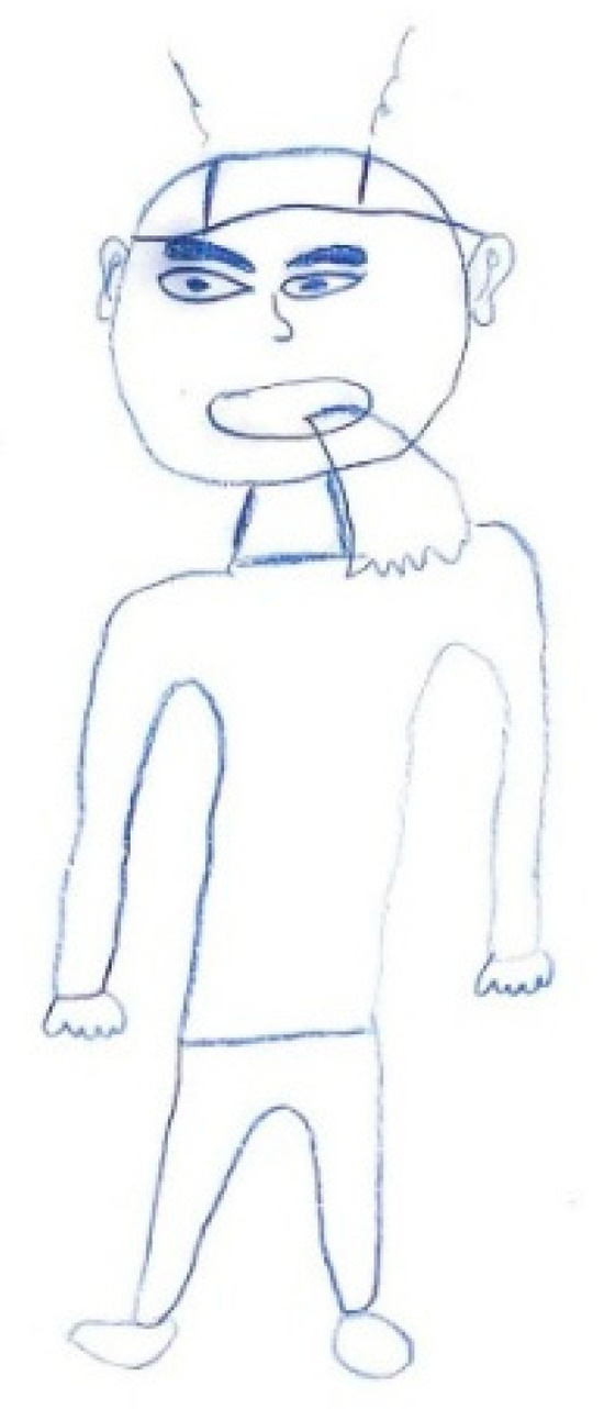 As descriptive and abstraction abilities mature in this population, their drawings show increasing complexity, elaboration, and often abstraction Figure 26. Rather than elementary geometric shapes, migraine pain sometimes becomes a thorny plant tightly rooted in the young patient’s head, and the areas where this manages to make its way outside the head correspond to those where the pain is perceived as better localized and more intense (for example the nape of the neck and the forehead) Figure 27.