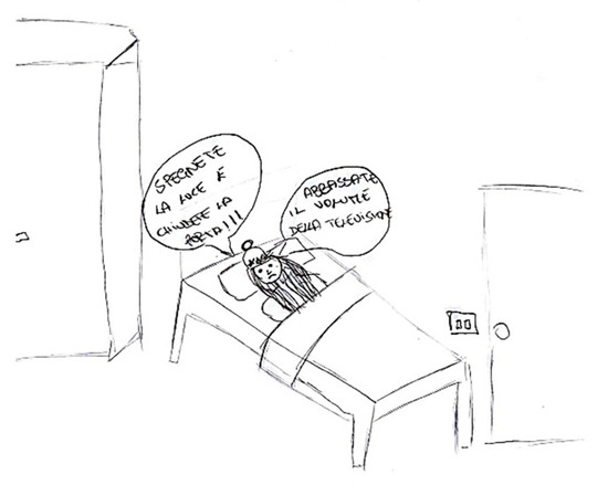 Female, 14 years old. Migraine. The girl writes turn off the lights (photophobia) and turn down the noise (sonophobia). In the first balloon the child says “Turn off the light and close the door” and in the second balloon says “turn down the volume of the television”.
