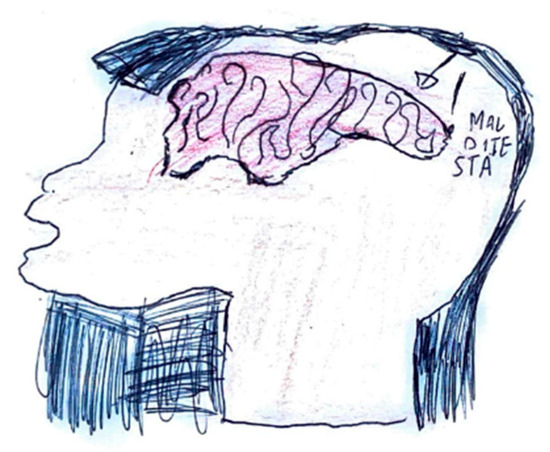 In one of the analyzed drawings, aphasia is represented with an explanatory speech bubble: “I couldn’t say the names of my family members, I stuttered.” Figure 20.