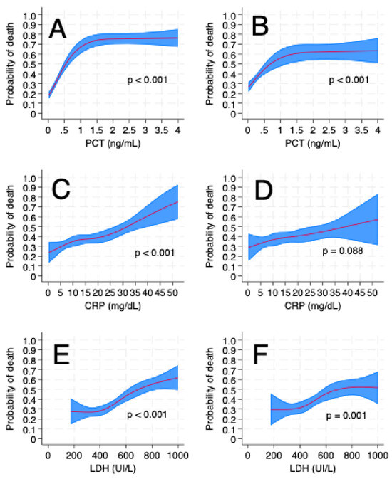 While procalcitonin (PCT) is considered more specific for bacterial infections, its levels also correlate with disease severity, making it an unreliable marker for distinguishing between bacterial and nonbacterial infections in critically ill patients, particularly in severe influenza and coronavirus cases [11]. Procalcitonin was the only biomarker with added prognostic information after accounting for illness severity of intensity of organ dysfunction and age. Its relationship with hospital mortality was non-linear, suggesting the need to account for this when using this biomarker at the bedside. Higher PCT levels are associated with increased disease severity and higher mortality rates in COVID-19 patients, but do not predict bacterial coinfection [25]. Several factors may explain why PCT remained the only biomarker independently linked to worse outcomes after adjusting for other relevant variables. Many previous studies failed to adequately account for illness severity or incorporate a comprehensive set of well-established prognostic factors, as we did.