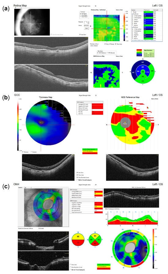 Optical coherence tomography (OCT) imaging following recovery from combined cataract surgery and vitrectomy, indicating glaucomatous optic neuropathy as the most likely primary cause of reduced visual acuity. (a) Macular OCT reveals no evidence of edema or other foveal pathology. (b) Ganglion cell complex (GCC) analysis demonstrates diffuse thinning, including the entire papillomacular bundle (note: segmentation artifacts that may underestimate GCC loss in the inferior portion of the papillomacular bundle may be observed in the horizontal B-scan). (c) The optic nerve head (ONH) OCT shows inferotemporal retinal nerve fiber layer (RNFL) thinning (note: reduced RNFL reflectivity and internal limiting membrane (ILM) thickening may be observed in the circular B-scan, contributing to segmentation artifacts that may underestimate the extent of overall RNFL loss).