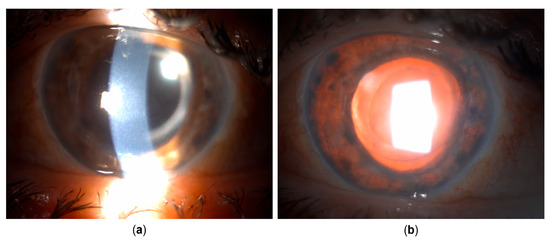 Clinical appearance several weeks after cataract surgery and pars plana vitrectomy. (a) Corneal edema developed. Pigmented corneal precipitates are no longer present. (b) Iris transillumination defects are now present circularly.