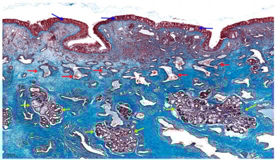 Transversal section of a human nasal turbinate stained with Masson’s trichrome. The respiratory epithelium (blue arrows) overlays a thickened lamina propria rich in congested blood vessels (red arrows) and enlarged mucoserous glands (yellow arrows). Image acquired at 10× magnification.
