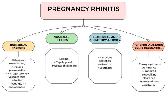 Pregnancy rhinitis is considered a multifactorial condition resulting from the complex interplay between hormonal, vascular, and mucosal changes during gestation. Unlike allergic or infectious rhinitis, this form of nasal congestion develops in the absence of identifiable triggers, suggesting that systemic pregnancy-related changes play a central role in its pathogenesis. Elevated levels of estrogen, progesterone, and placental hormones are thought to contribute significantly by modifying the structure and function of the nasal mucosa. In addition to endocrine influence, alterations in blood volume and vascular permeability, as well as functional changes in ciliary activity and mucosal glandular secretion, have all been implicated []. Understanding these mechanisms is essential for differentiating pregnancy rhinitis from other nasal disorders and for guiding both diagnosis and management.