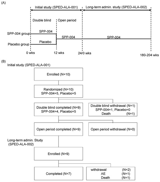 The initial study was an exploratory clinical trial conducted as a multicenter, double-blind, and randomized test with an initial 12-week placebo-controlled period, followed by a second 12-week open-label period (SPED-ALA-001). The first double-blind period was set up to avoid leaving the placebo group untreated, considering the severe symptoms of pediatric LS. The administration of the study drug was continued in the subsequent long-term study up to termination (SPED-ALA-002) (Figure 1A). The long-term study was conducted as a multicenter, unblinded, and non-randomized study.