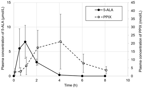 The pharmacokinetics of oral 5-ALA were monitored in all patients. As shown in Figure 2, the plasma 5-ALA level reached the maximum concentration (mean = 7.00 µmol/L; Table 3) at 1 h and completely disappeared at 4 h. The plasma PPIX concentration was also monitored by measuring its fluorescence (excitation light wavelength: 405 nm; emission light wavelength: 630 nm) (Figure 2). The plasma PPIX concentration gradually increased over 4 h after the oral administration of 5-ALA and nearly disappeared from the plasma after 8 h. The plasma PPIX concentration varied among the patients, with the maximum concentrations ranging from 6.58 to 49.2 nmol/L (Table 3).