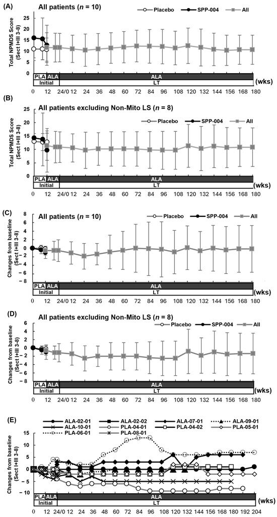 Changes in total NPMDS scores (section I and section III items 3-8). (A,B) Mean ± SD of each dose group. (A) All patients (n = 10). (B) All patients, excluding Non-Mito LS patients (n = 8). (C,D) Mean ± SD of change from baseline of each dose group. (C) All patients (n = 10). (D) All patients, excluding Non-Mito LS patients (n = 8). (E) Change from baseline in each patient. Dotted lines show the change in Non-Mito LS patients. ALA: SPP-004, PLA: Placebo, P2: SPED-ALA-001 study, and LT: SPED-ALA-002 study. The total score includes hearing, communication, and movement (section I), as well as vision, ptosis and eye movement, myopathy, pyramidal, extrapyramidal, and neuropathy (section III).