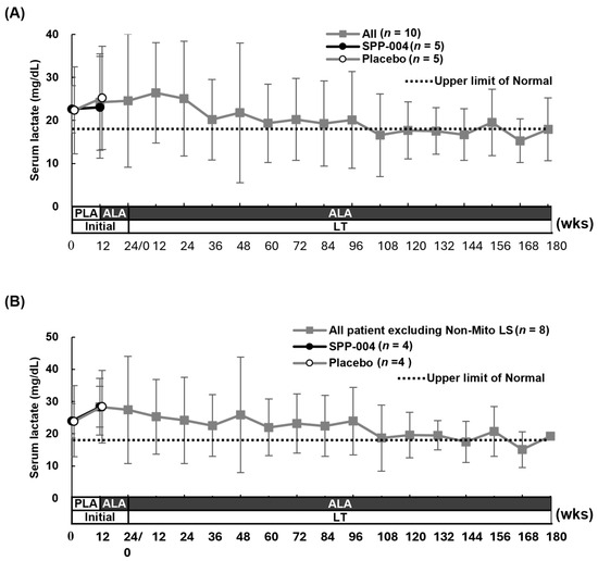 Changes in serum lactate. (A) All patients. (B) All patients, excluding Non-Mito LS patients. The average ± SD is shown. The dotted line indicates the upper limit of the normal range (18.0 mg/dL).